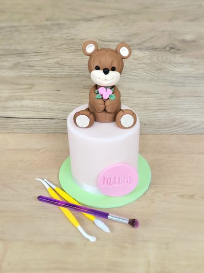 Learn how to create this mini cake and bear topper. A 4 inch round, vanilla sponge cake will be provided, ganache coated and ready to ice and decorate. I'll show you step by step how to complete each part of the decorating process and modelling the topper figure.